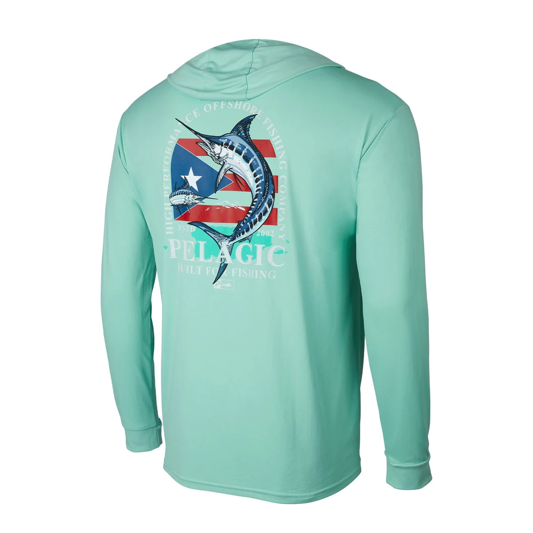 • Paying homage to Puerto Rico with a blue marlin graphic surrounding the Puerto Rican flag, stamped with the Pelagic logo