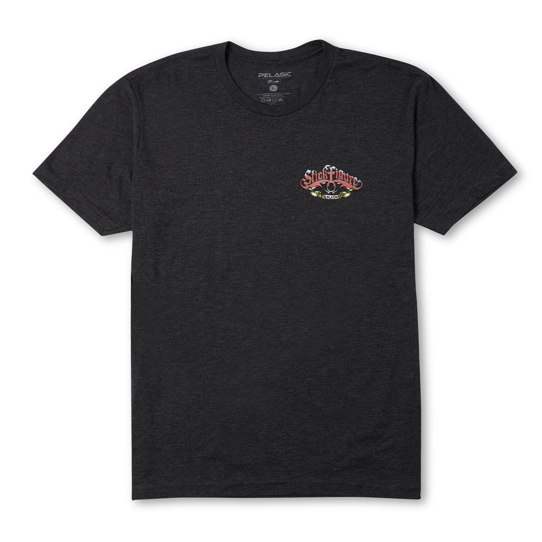 This limited-edition ultra-soft Tri-Blend tee features custom Pelagic x Stick Figure “Paradise” graphics with large print on back and front-left chest logo.