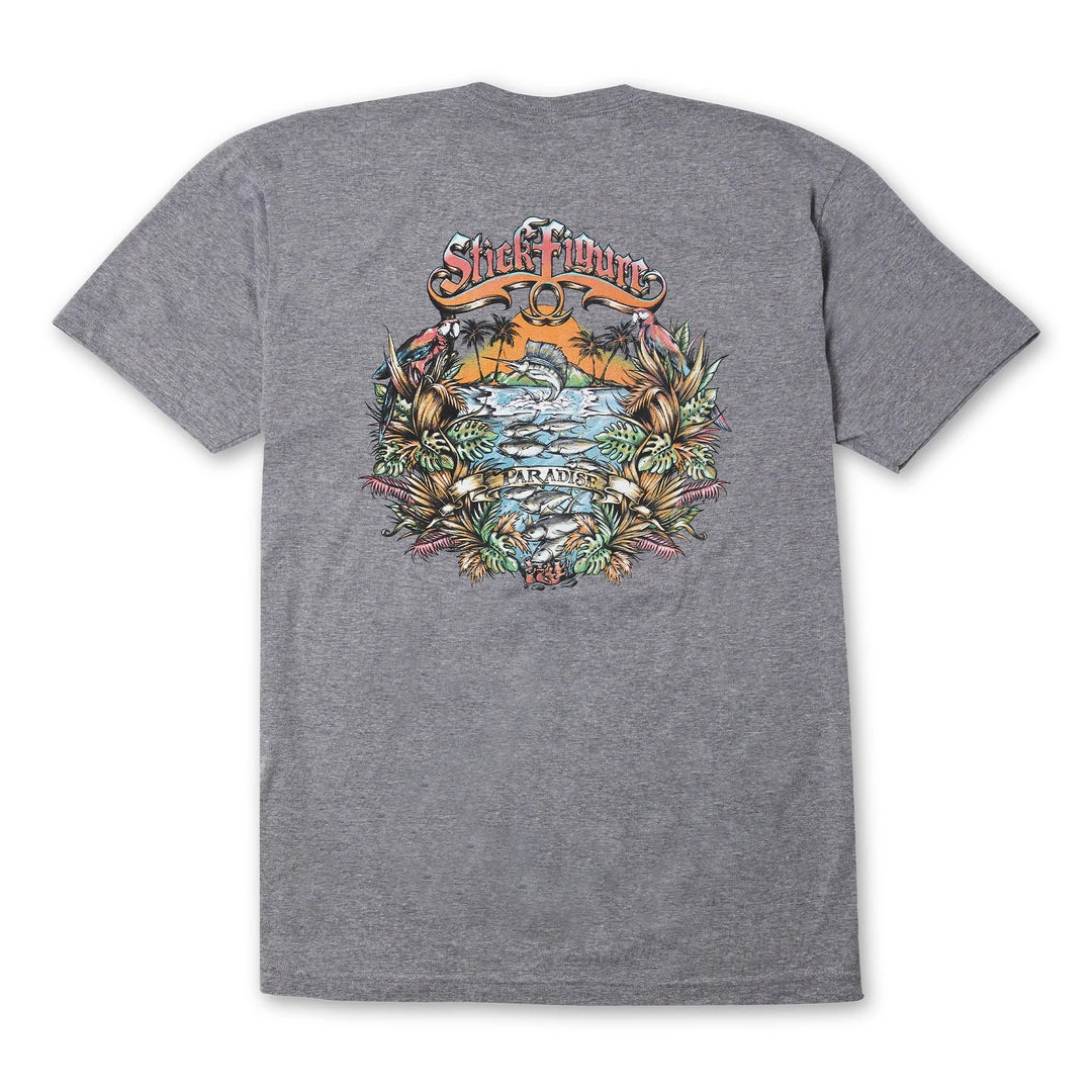 This limited-edition ultra-softΒ Tri-Blend teeΒ features custom Pelagic x Stick Figure βParadiseβ graphics with large print on back and front-left chest logo.Β