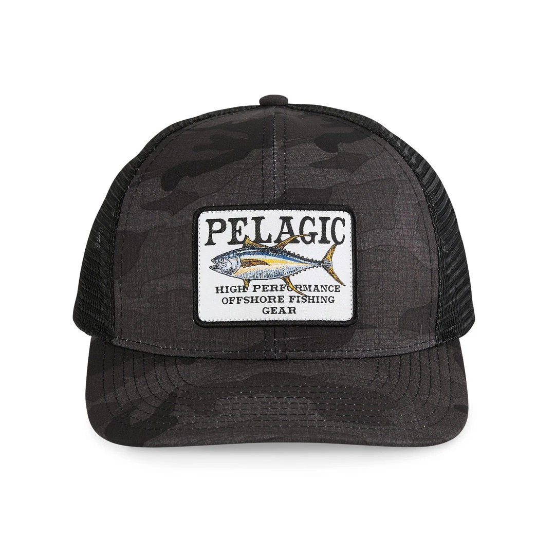 - Trucker hat featuring a front embroidered game fish tuna patch