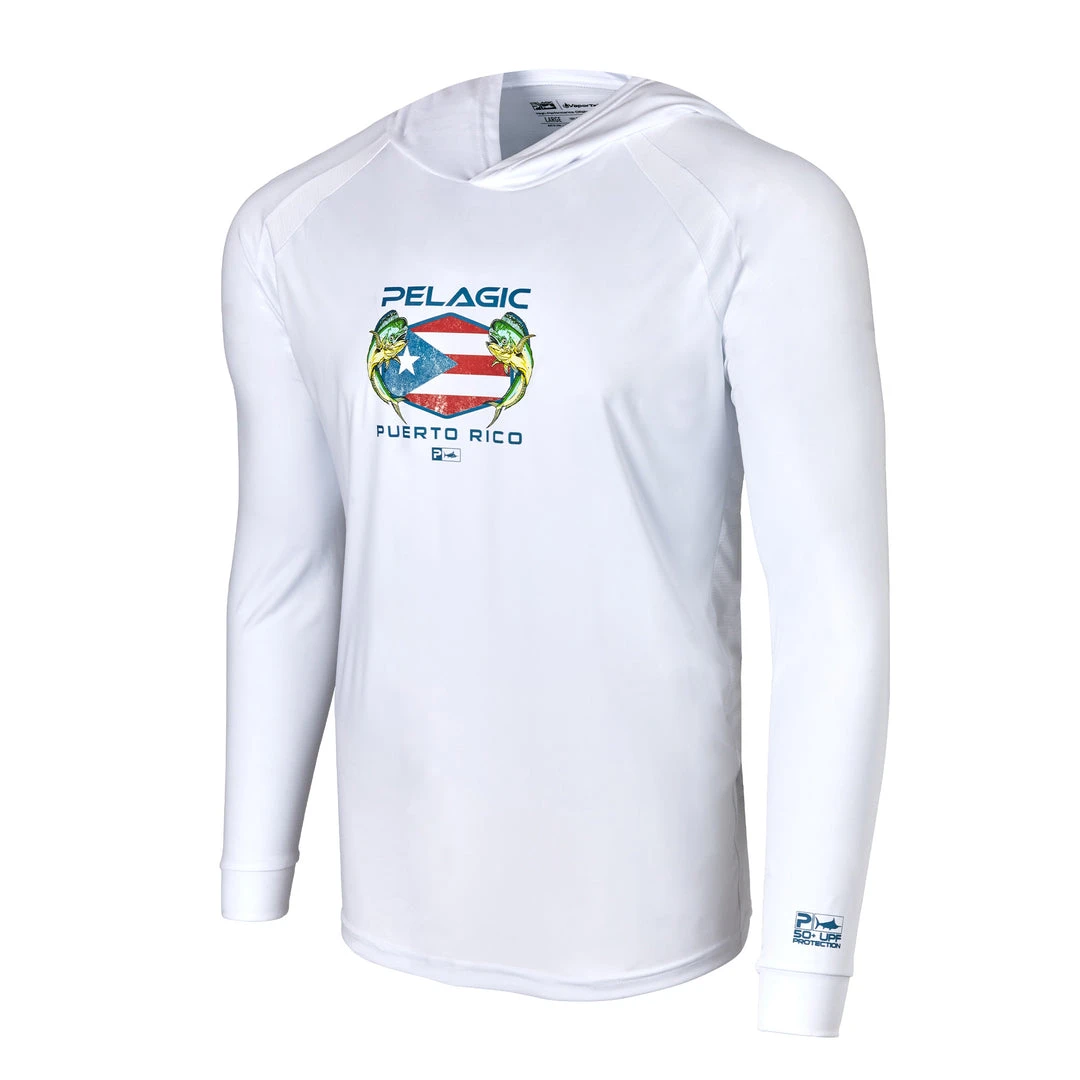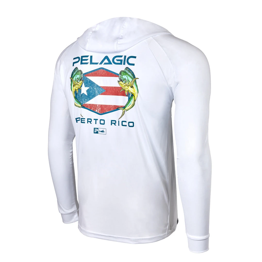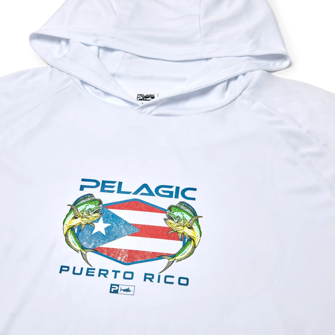 - Paying homage toΒ Puerto RicoΒ with dolphin fish graphics surrounding the Puerto Rican flag, stamped with the Pelagic logo